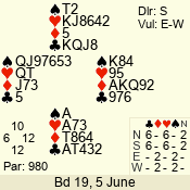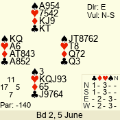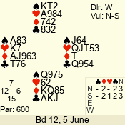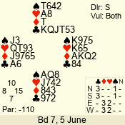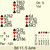 | Con | Dc | Res | Score | Ld | Pairs | Rd | Tbl | | 3 N | W | -2 | 100 | J | 07 - 02 | 6 | 7 |