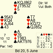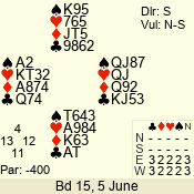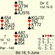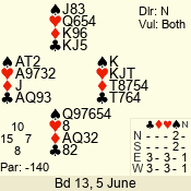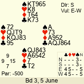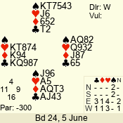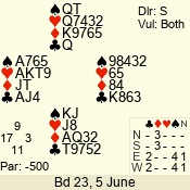 | Con | Dc | Res | Score | Ld | Pairs | Rd | Tbl | | 3 N x | E | -2 | 300 | 6 | 06 - 05 | 2 | 6 |