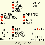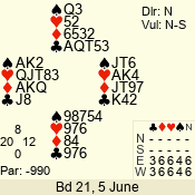 | Con | Dc | Res | Score | Ld | Pairs | Rd | Tbl | | 3 N | N | +3 | 490 | 4 | 07 - 07 | 1 | 7 |