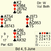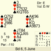 | Con | Dc | Res | Score | Ld | Pairs | Rd | Tbl | | 6 N | E | -1 | 50 | 4 | 02 - 05 | 6 | 2 |