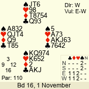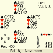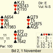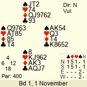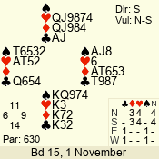| Con | Dc | Res | Score | Ld | Pairs | Rd | Tbl | | 3 N | N | +1 | 630 | 9 | 03 - 03 | 1 | 3 |