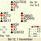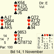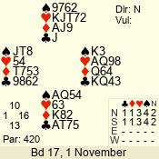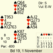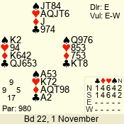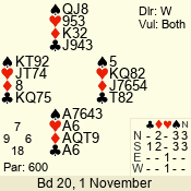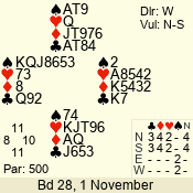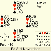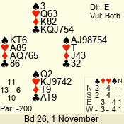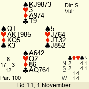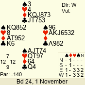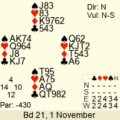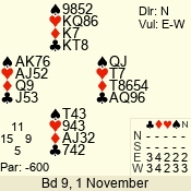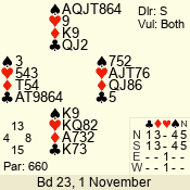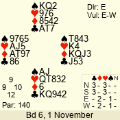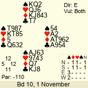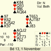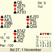 | Con | Dc | Res | Score | Ld | Pairs | Rd | Tbl | | 3 N | S | = | 400 | 3 | 01 - 09 | 13 | 1 |