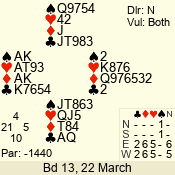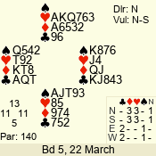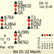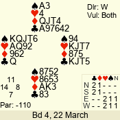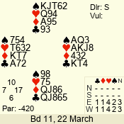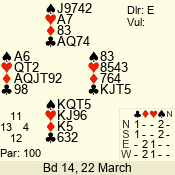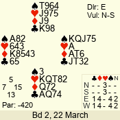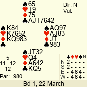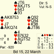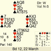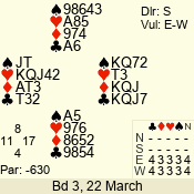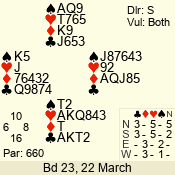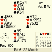 | Con | Dc | Res | Score | Ld | Pairs | Rd | Tbl | | 3 N | S | = | 600 | T | 03 - 01 | 3 | 3 |