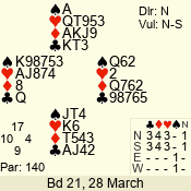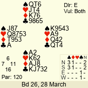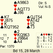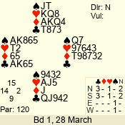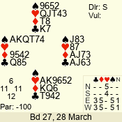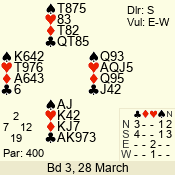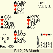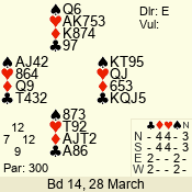 | Con | Dc | Res | Score | Ld | Pairs | Rd | Tbl | | 3 N | S | = | 400 | 3 | 14 - 05 | 5 | 6 |