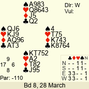 | Con | Dc | Res | Score | Ld | Pairs | Rd | Tbl | | 3 N | S | +1 | 630 | 3 | 13 - 08 | 4 | 7 |