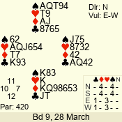 | Con | Dc | Res | Score | Ld | Pairs | Rd | Tbl | | 3 N | W | -1 | 50 | 2 | 01 - 02 | 9 | 2 |