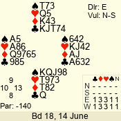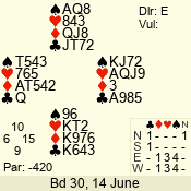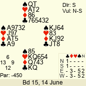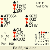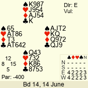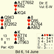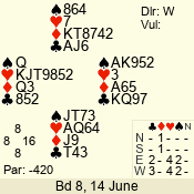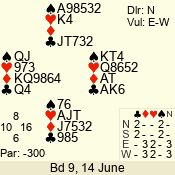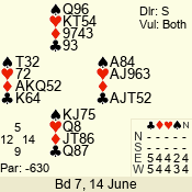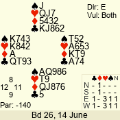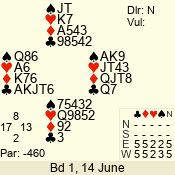 | Con | Dc | Res | Score | Ld | Pairs | Rd | Tbl | | 3 N | N | +1 | 430 | 9 | 07 - 04 | 9 | 6 |