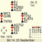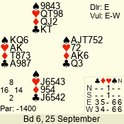 | Con | Dc | Res | Score | Ld | Pairs | Rd | Tbl | | 3 N | S | +1 | 630 | 4 | 02 - 04 | 7 | 2 |