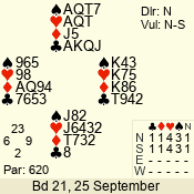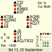 | Con | Dc | Res | Score | Ld | Pairs | Rd | Tbl | | 3 N | S | +1 | 630 | 4 | 02 - 04 | 7 | 2 |