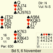 | Con | Dc | Res | Score | Ld | Pairs | Rd | Tbl | | 3 N | N | +1 | 630 | 3 | 05 - 07 | 10 | 5 |