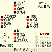 | Con | Dc | Res | Score | Ld | Pairs | Rd | Tbl | | 3 N | S | +3 | 690 | 5 | 09 - 11 | 8 | 2 |