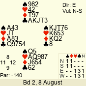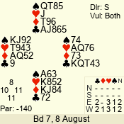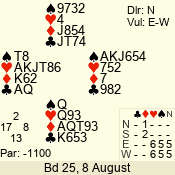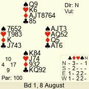 | Con | Dc | Res | Score | Ld | Pairs | Rd | Tbl | | 3 N | S | +3 | 690 | 5 | 09 - 11 | 8 | 2 |