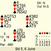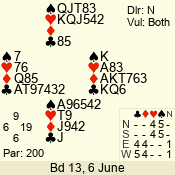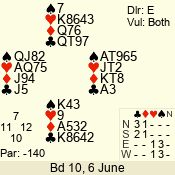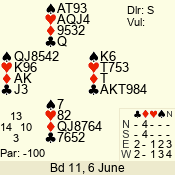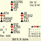 | Con | Dc | Res | Score | Ld | Pairs | Rd | Tbl | | 3 N | S | +1 | 430 | J | 02 - 03 | 9 | 2 |