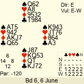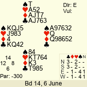 | Con | Dc | Res | Score | Ld | Pairs | Rd | Tbl | | 3 N | E | -3 | 300 | 9 | 02 - 06 | 6 | 2 |
