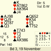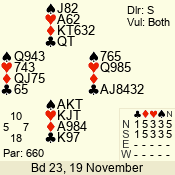 | Con | Dc | Res | Score | Ld | Pairs | Rd | Tbl | | 3 N | N | +2 | 660 | 4 | 01 - 10 | 12 | 1 |