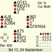 | Con | Dc | Res | Score | Ld | Pairs | Rd | Tbl | | 3 NT | N | = | 600 | 2 | 05 - 11 | 1 | 6 |