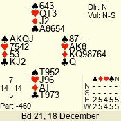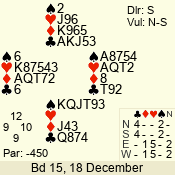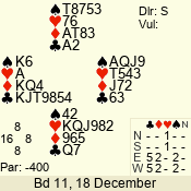 | Con | Dc | Res | Score | Ld | Pairs | Rd | Tbl | | 3 N | S | = | 400 | 3 | 14 - 12 | 3 | 14 |