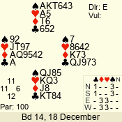 | Con | Dc | Res | Score | Ld | Pairs | Rd | Tbl | | 3 N | N | +1 | 630 | 4 | 14 - 14 | 1 | 14 |