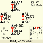 | Con | Dc | Res | Score | Ld | Pairs | Rd | Tbl | 4  | S | = | 620 | A | 04 - 08 | 12 | 4 |