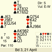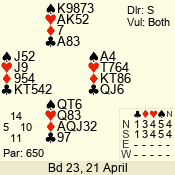 | Con | Dc | Res | Score | Ld | Pairs | Rd | Tbl | | 3 NT | S | +2 | 460 | T | 04 - 05 | 9 | 4 |