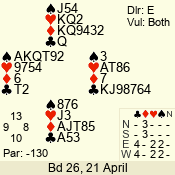 | 3 NT | W | +1 | -630 | 2 | 08 - 05 | 4 | 8 |