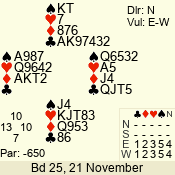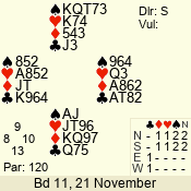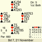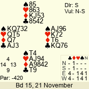| 3 NT | W | +2 | -660 | 7 | 11 - 12 | 13 | 11 |