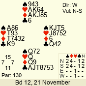 | 3 NT | W | +1 | -430 | 8 | 12 - 12 | 1 | 12 |