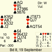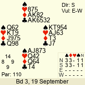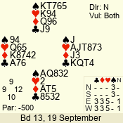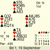| Con | Dc | Res | Score | Ld | Pairs | Rd | Tbl | | 3 N | N | +1 | 430 | 9 | 02 - 08 | 3 | 5 |