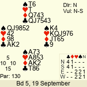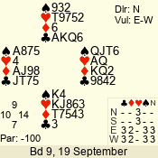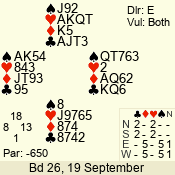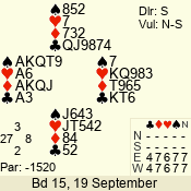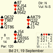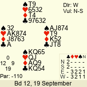 | Con | Dc | Res | Score | Ld | Pairs | Rd | Tbl | | 3 N | S | = | 600 | 4 | 12 - 02 | 2 | 1 |