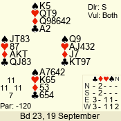 | Con | Dc | Res | Score | Ld | Pairs | Rd | Tbl | | 1 N | E | -1 | 100 | 6 | 09 - 05 | 8 | 4 |
