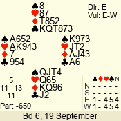 | Con | Dc | Res | Score | Ld | Pairs | Rd | Tbl | | 6 N | E | = | -990 | 4 | 03 - 08 | 2 | 4 |