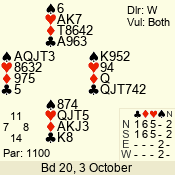 | Con | Dc | Res | Score | Ld | Pairs | Rd | Tbl | | 3 N | S | = | 400 | 2 | 03 - 06 | 8 | 3 |
