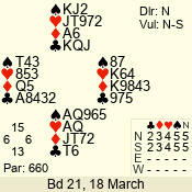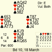 | Con | Dc | Res | Score | Ld | Pairs | Rd | Tbl | | 3 N | S | = | 600 | 9 | 05 - 02 | 4 | 5 |