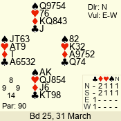 | Con | Dc | Res | Score | Ld | Pairs | Rd | Tbl | | 3 NT | N | +2 | 660 | T | 01 - 03 | 9 | 6 |