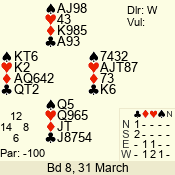 | Con | Dc | Res | Score | Ld | Pairs | Rd | Tbl | | 3 NT | W | -1 | 100 | 3 | 10 - 08 | 8 | 1 |