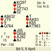 | Con | Dc | Res | Score | Ld | Pairs | Rd | Tbl | | 5 N | S | +1 | 490 | 3 | 04 - 09 | 5 | 4 |