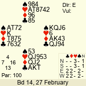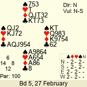 | Con | Dc | Res | Score | Ld | Pairs | Rd | Tbl | | 1 N | E | -1 | 100 | 3 | 02 - 08 | 3 | 5 |