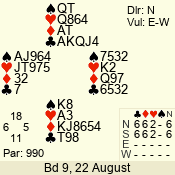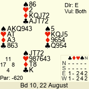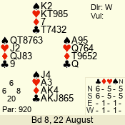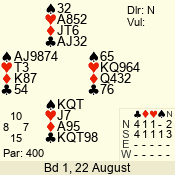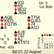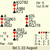 | Con | Dc | Res | Score | Ld | Pairs | Rd | Tbl | | 3 N | E | -4 | 400 | 5 | 05 - 05 | 11 | 5 |