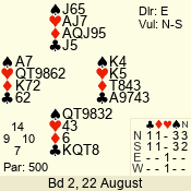 | Con | Dc | Res | Score | Ld | Pairs | Rd | Tbl | | 2 N | E | -1 | 100 | K | 04 - 07 | 8 | 4 |