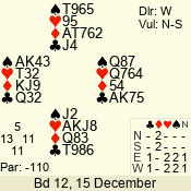 | Con | Dc | Res | Score | Ld | Pairs | Rd | Tbl | | 3 N | W | -2 | 200 | T | 01 - 10 | 12 | 1 |
