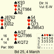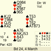 | Con | Dc | Res | Score | Ld | Pairs | Rd | Tbl | | 6 NT | S | = | 990 | 5 | 03 - 04 | 13 | 3 |
