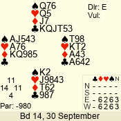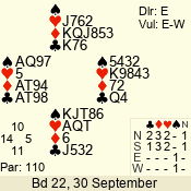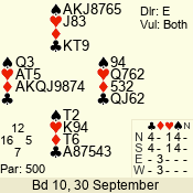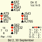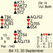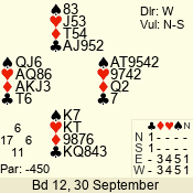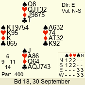 | Con | Dc | Res | Score | Ld | Pairs | Rd | Tbl | | 3 N | E | -4 | 400 | Q | 03 - 02 | 2 | 3 |