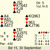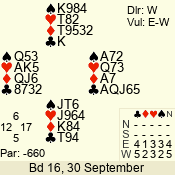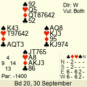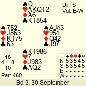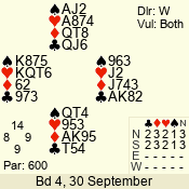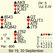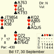 | Con | Dc | Res | Score | Ld | Pairs | Rd | Tbl | | 3 N | S | +1 | 630 | 3 | 08 - 02 | 7 | 8 |