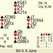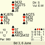 | Con | Dc | Res | Score | Ld | Pairs | Rd | Tbl | | 3 N | N | +2 | 460 | 9 | 01 - 04 | 7 | 1 |