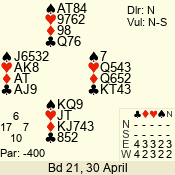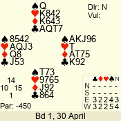 | Con | Dc | Res | Score | Ld | Pairs | Rd | Tbl | | 3 N | N | +1 | 430 | 3 | 01 - 07 | 4 | 1 |