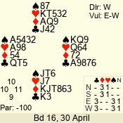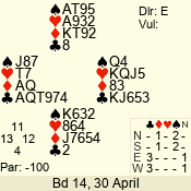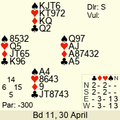 | Con | Dc | Res | Score | Ld | Pairs | Rd | Tbl | | 3 N | E | -3 | 300 | 2 | 02 - 07 | 12 | 2 |