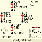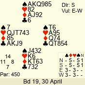 | Con | Dc | Res | Score | Ld | Pairs | Rd | Tbl | | 3 N | N | +1 | 430 | 3 | 01 - 07 | 4 | 1 |