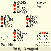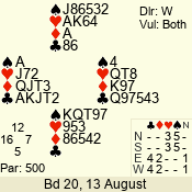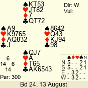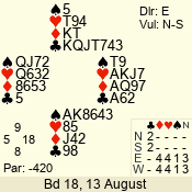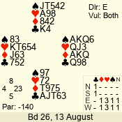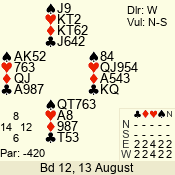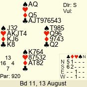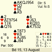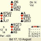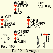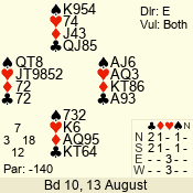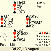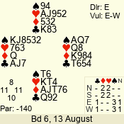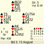 | Con | Dc | Res | Score | Ld | Pairs | Rd | Tbl | | 3 N | N | +1 | 430 | 5 | 06 - 04 | 3 | 6 |