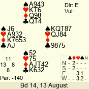 | Con | Dc | Res | Score | Ld | Pairs | Rd | Tbl | | 3 N | E | -2 | 200 | K | 02 - 03 | 7 | 2 |