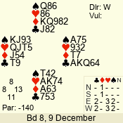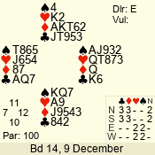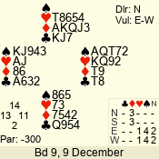 | Con | Dc | Res | Score | Ld | Pairs | Rd | Tbl | | 3 N | E | -2 | 200 | 4 | 03 - 08 | 9 | 3 |